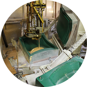 左の写真は、弊社の座をノルウェー国で生産していいるモールドウレタン製造の工程写真です。雄雌の型に特殊なウレタンの材料を流し込み、熱を加えて発砲させます。