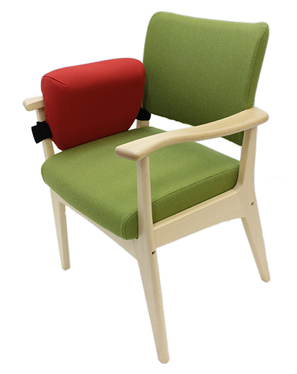 パーキンソン病の方など側方に傾く方の為にベナー側方サポートクッションは、座位のバランスが悪く傾いてしまう高齢者に配慮された座位補助具です。高齢者の自立的生活を支援する為の用具として開発しました。マジックテープで左右どちらにでも取り付けることができ、傾きの程度によって腕の真ん中あたりの高さと、腕を乗せられる程度の低い、2種類の大きさがあります。