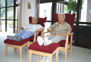 施設見学に来られるご家族様の関心ごとは、介護、ユニットの環境、食事内容、緊急時の対応、催事などで、椅子に注目される方はほとんどいない。しかし 帰りに皆様が「この施設は明るい雰囲気がありまね!」言います。